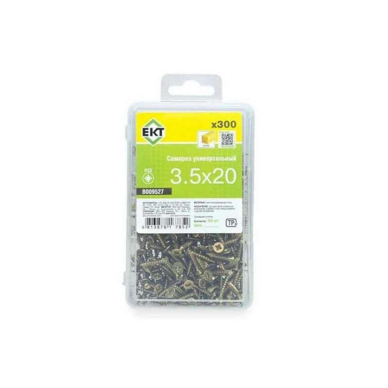 Универсальный саморез из стали с желтым цинковым покрытием. Размер 3.5x20 мм. Предназначен для работы с деревом, ДСП и ПВХ. Упаковка: пластиковый контейнер (300 шт).