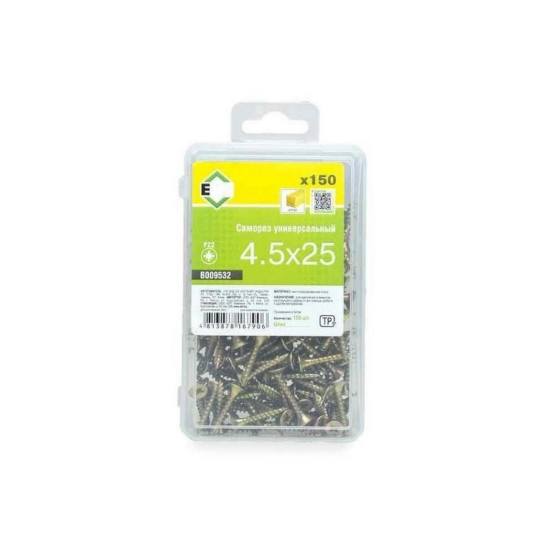 Саморезы универсальные из стали с желтым цинковым покрытием. Размер: 4.5x25 мм. Острый наконечник. Упаковка: пластиковый контейнер (BOX). Количество в упаковке: 150 шт.