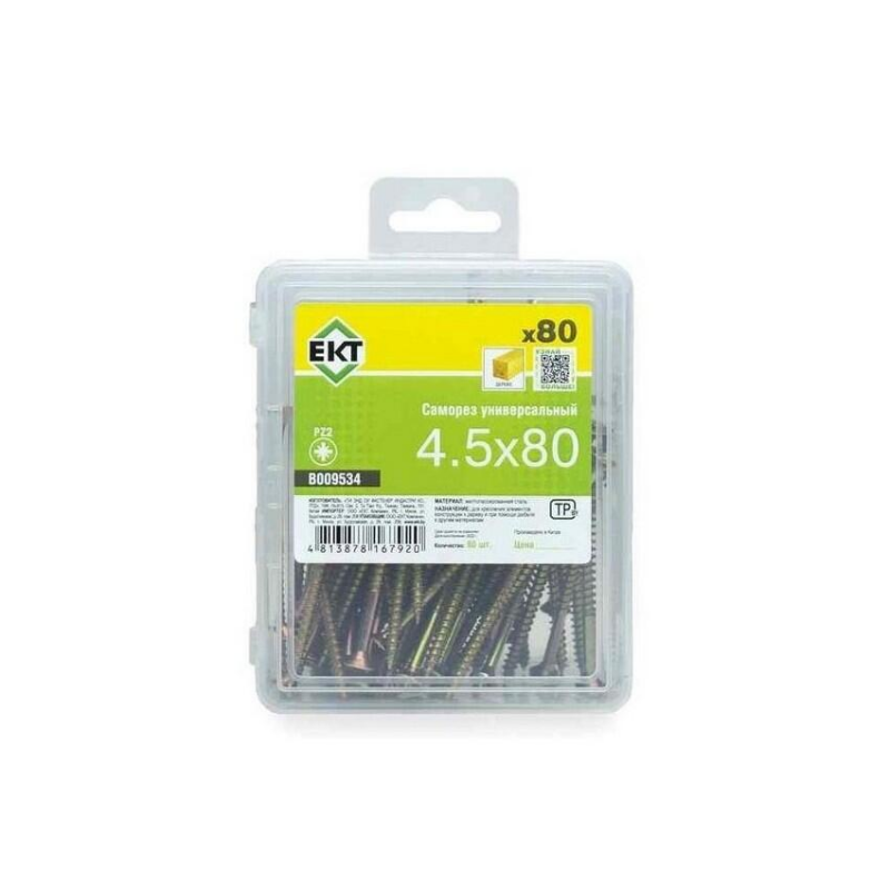 Универсальный саморез из стали с желтым цинковым покрытием. Острый наконечник, диаметр резьбы 4.5 мм, длина 80 мм. Упаковка: пластиковый контейнер (80 шт).