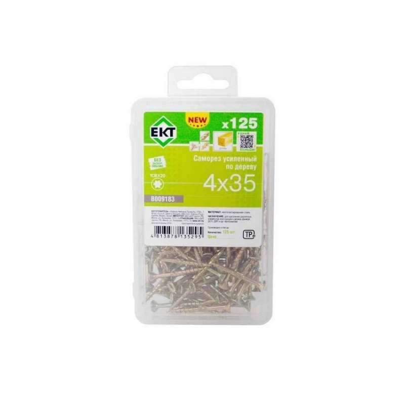 Саморез усиленный TORх20 4.0х35 мм по дереву. Сталь с желтым цинковым покрытием, потайная головка, острый наконечник. Упаковка: пластиковый контейнер (125 шт). Бренд: ЕКТ. Произведено в Китай.