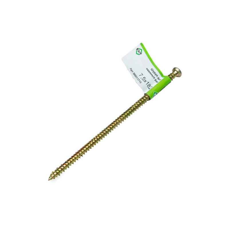 Усиленный шуруп для оконных рам 7,5х182 мм. Изготовлен из прочной стали с острым наконечником. Продается поштучно с этикеткой. Надежный крепеж для ответственных соединений.