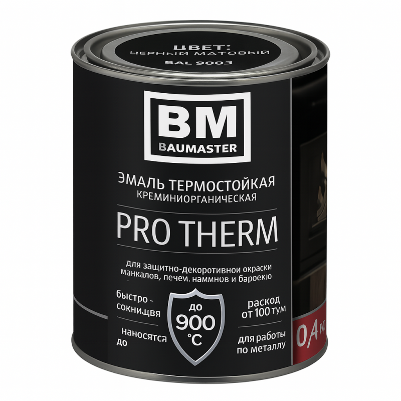 Термостойкая матовая эмаль BAUMASTER черного цвета (RAL9004) для защиты поверхностей, эксплуатируемых в тяжелых условиях. Выдерживает температуры от -60°C до +900°C. Основа: кремнийорганическая. Вес: 0.4 кг. Расход: от 0.1 кг/м².