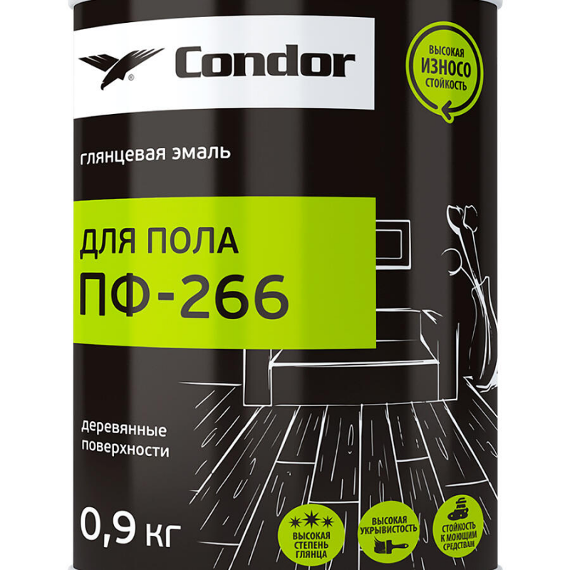 Эмаль Condor ПФ-266 — глянцевая светло-серая эмаль на пентафталевой основе для внутренних работ. Предназначена для окрашивания деревянных полов, лестниц и других деревянных оснований. Образует прочное, износостойкое покрытие с эффектным глянцевым блеском. Разбавляется уайт-спиритом, возможно колерование.