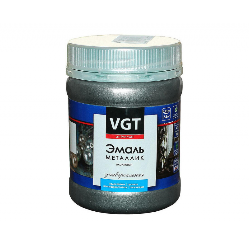 Декоративная акриловая эмаль VGT «Металлик» цвета серебро для создания эффектного покрытия с натуральным металлическим блеском. Предназначена для окраски дерева, гипса, керамики, металла (алюминий, оцинковка), пластика, полистирола и обоев. Подходит для внутренних и наружных работ. Полуглянцевое покрытие, объем 0.23 кг.