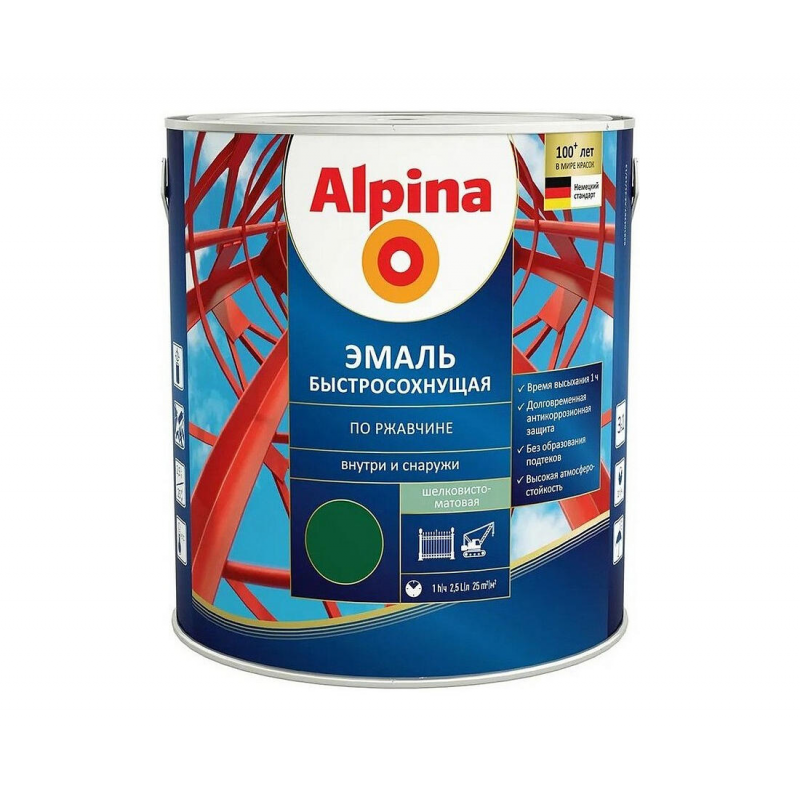 Быстросохнущая грунт-эмаль Alpina 3 в 1 для антикоррозионной защиты и декоративной отделки черных металлов. Сочетает свойства грунтовки, антикоррозионной защиты и финишной эмали. Не требует предварительного грунтования. Образует шелковисто-матовое покрытие зеленого цвета (RAL6005), устойчивое к атмосферным воздействиям, маслам и бензину.