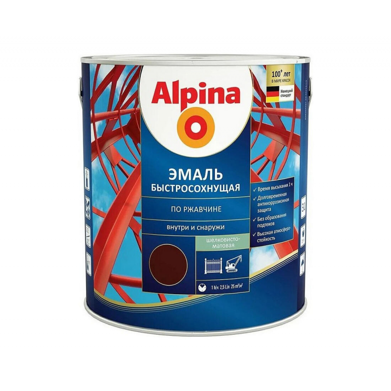 Грунт-эмаль Alpina быстросохнущая «3 в 1» для надёжной антикоррозионной защиты и декоративной отделки черных металлов. Объединяет функции грунтовки, антикоррозионного покрытия и финишной эмали. Образует прочное шелковисто-матовое покрытие цвета шоколадный RAL 8017, устойчивое к воздействию влаги, масел, бензина и нефтепродуктов. Объём: 2,5 л.