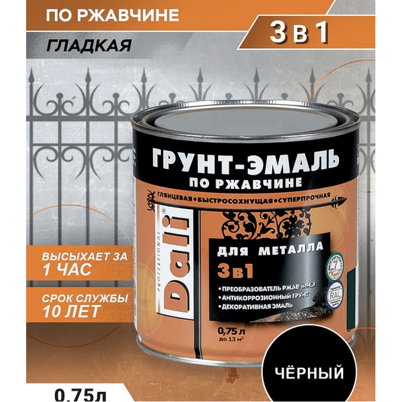 Грунт-эмаль Dali 3в1 по ржавчине черного цвета. Алкидная краска для защитно-декоративной обработки металлических поверхностей внутри и снаружи помещений. Применяется по новым, ранее окрашенным и пораженным коррозией (до 100 мкм) поверхностям: стали, чугуну, оцинковке, цветным металлам и биметаллам. Образует прочное глянцевое покрытие с молотковым эффектом. Объем: 0,75 л.