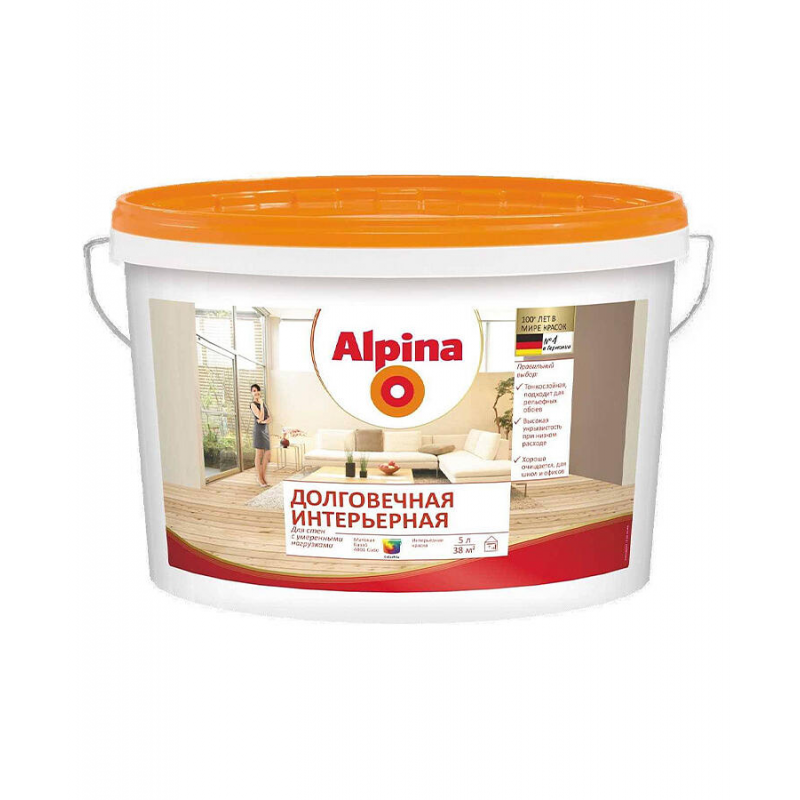 Интерьерная матовая краска Alpina для потолков. Объем 5 л. Белая база для колеровки. Акриловая основа. Быстро сохнет (6 часов). Низкий расход (0.13 л/м²).