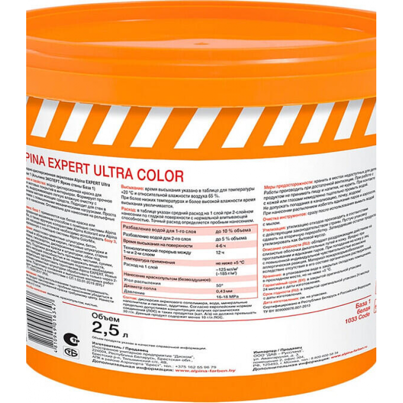 Водно-дисперсионная матовая краска для интерьера Alpina EXPERT Ultra Color. Создает прочное и долговечное покрытие, устойчивое к влажной уборке с моющими средствами. Идеально подходит для стен и потолков в помещениях с повышенной проходимостью, а также для нанесения на рельефные обои. Обладает отличной укрывистостью и легко наносится.