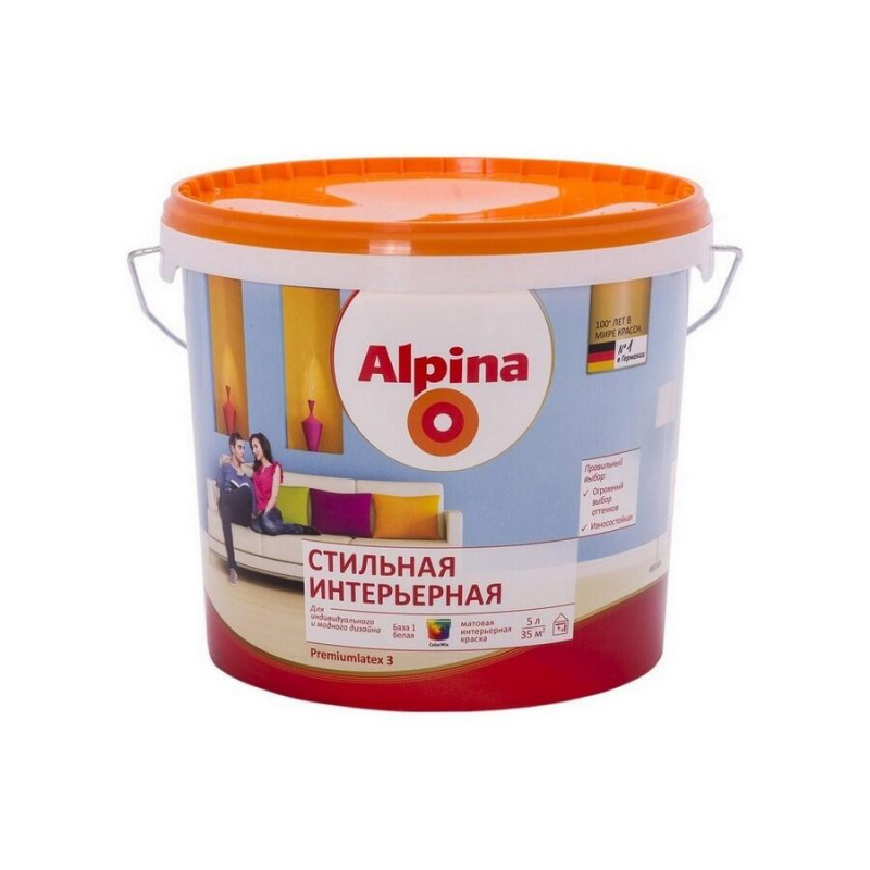 Матовая интерьерная краска Alpina белого цвета, база 1 для колеровки в светлые оттенки. Объем 5 литров (8,2 кг). Подходит для машинной колеровки системой Alpina ColorMix или ручной с колорантами Alpina. Применяется для покраски стен и потолков внутри помещений.