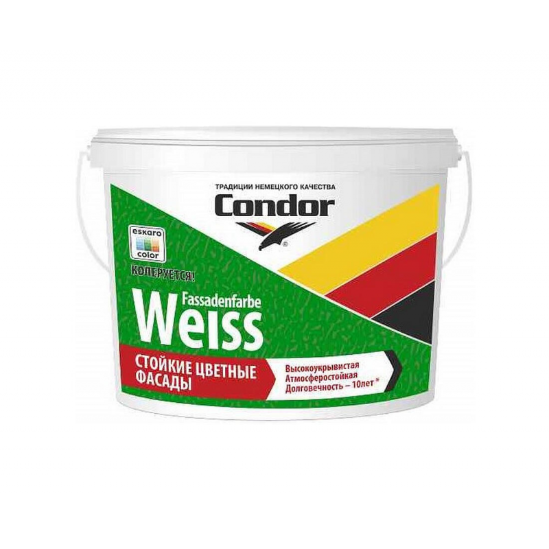 Водно-дисперсионная матовая краска Condor Fassadenfarbe для создания долговечных и качественных покрытий. Предназначена для наружных и внутренних работ, в том числе в помещениях с высокой влажностью. Образует прочное, паропроницаемое покрытие, интенсивно защищающее от биопоражений. Объем: 10 л (15 кг). Цвет: белый (колеруется). Время высыхания: 4-6 часов. Примерный расход: 0,17 л/м².