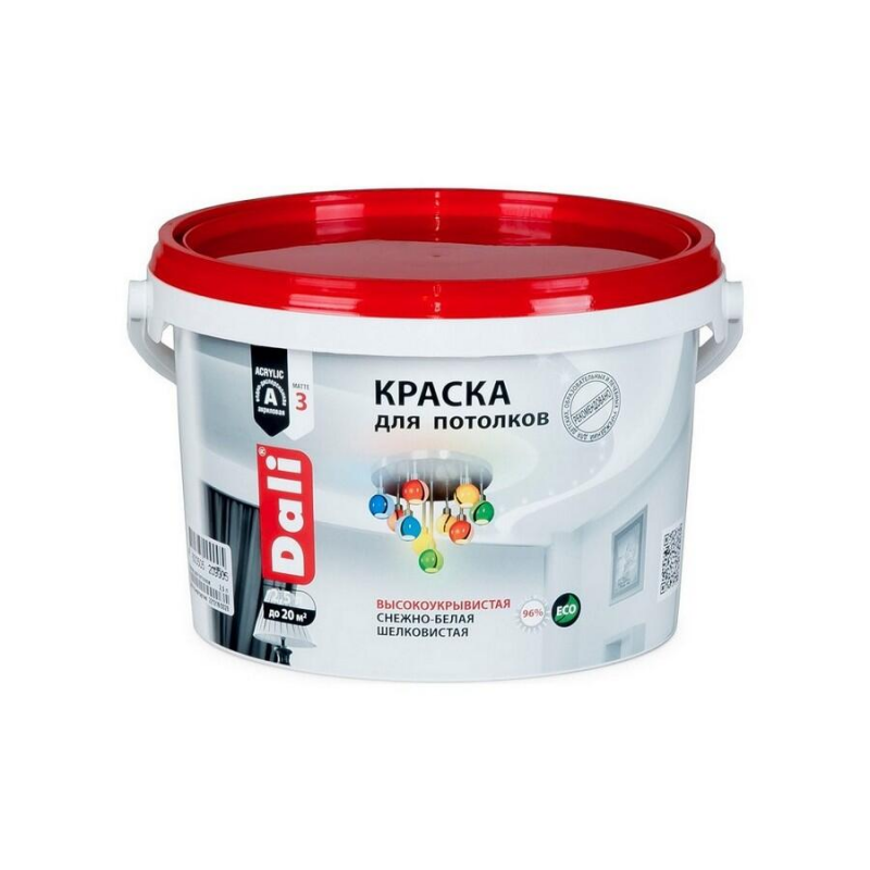 Акриловая краска DALI для декоративного окрашивания потолков в жилых и общественных помещениях. Создает глубокоматовое, белоснежное, шелковистое покрытие. Обладает высокой укрывистостью, экономичным расходом (0.125 л/м²) и быстрым временем высыхания (2 часа). Не имеет запаха, разрешена к применению в детских, образовательных и медицинских учреждениях.