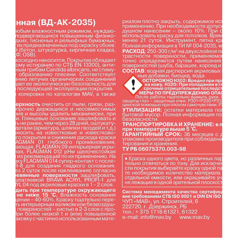 Матовая акриловая краска FLAGMAN 35 для стен и потолков в помещениях с повышенной влажностью и высокими требованиями к износостойкости. Подходит для кухонь, ванных комнат, санузлов, коридоров, детских и медицинских учреждений. Образует ровное матовое покрытие, колеруется в тысячи оттенков. Объем: 1,1 кг.