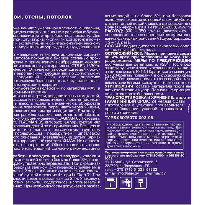 Тщательно перемешать перед нанесением. Наносить валиком (ворс 11-13 мм), кистью или распылителем в 1-2 слоя. Разбавлять водой не более 5-10%. Время высыхания между слоями: 4 часа при +20°C. Расход: 300-350 г/м² на два слоя. Первую влажную уборку проводить не ранее, чем через 21 сутки.