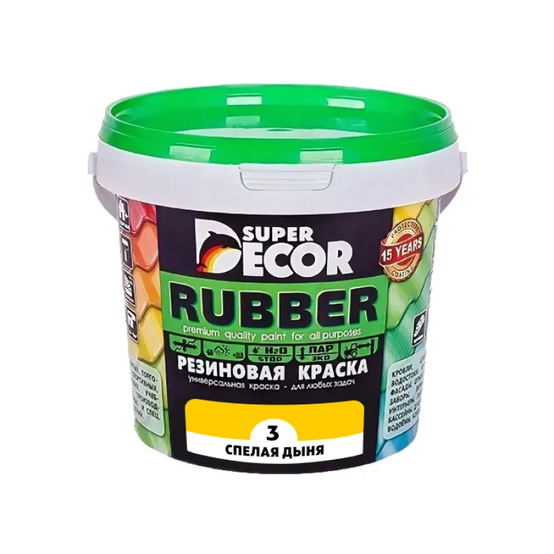 Резиновая краска SUPER DECOR №03 Спелая дыня — универсальное покрытие для внутренних и наружных работ. Обладает высокой эластичностью, устойчивостью к влаге и перепадам температур. Подходит для нанесения на дерево, металл, минеральные поверхности (бетон, кирпич, гипсокартон) и пластик. Матовая, желтого цвета, вес 1 кг.