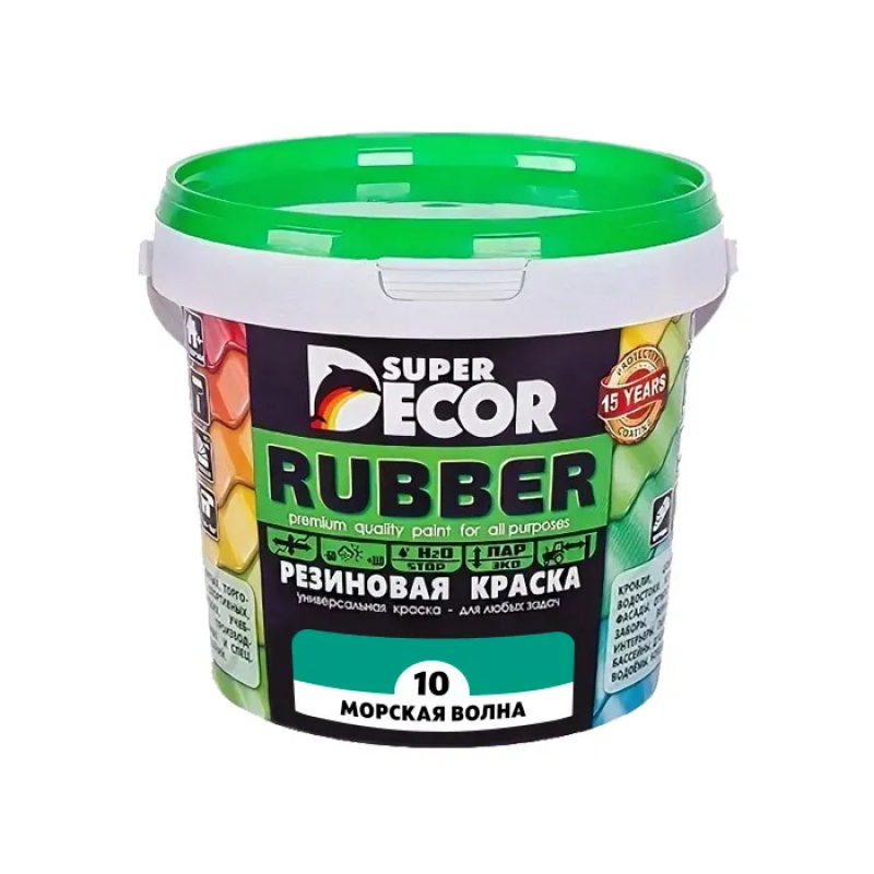 Резиновая краска SUPER DECOR №10 «Морская волна» — это универсальное матовое покрытие на латексной основе для наружных и внутренних работ. Обладает высокой эластичностью, адгезией и водоотталкивающими свойствами. Подходит для нанесения на минеральные поверхности, дерево, металл и пластик. Расход: от 0.25 до 0.45 кг/м², время высыхания — 10 часов. Объем: 1 л (1 кг).