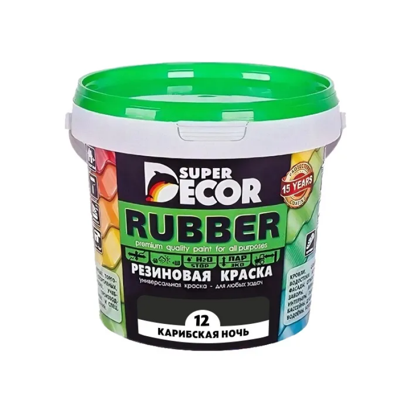 Резиновая краска SUPER DECOR №12 'Карибская ночь' – универсальное матовое покрытие на латексной основе для наружных и внутренних работ. Обладает высокой эластичностью, водоотталкивающими свойствами и отличной адгезией к большинству поверхностей. Идеально подходит для покраски крыш, фасадов, заборов, цоколей, а также для влажных помещений и гаражей. Цвет: черный. Вес: 1 кг.