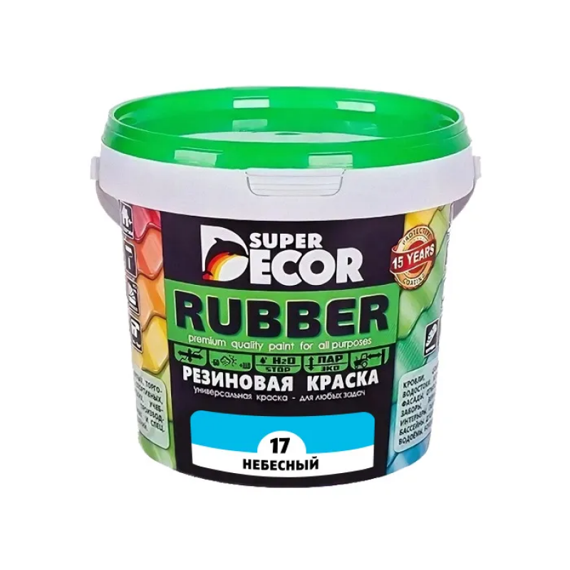 Резиновая краска SUPER DECOR №17 Небесный — универсальное покрытие для внутренних и наружных работ. Подходит для нанесения на минеральные поверхности (бетон, кирпич, гипсокартон), дерево, металл и пластик. Обладает матовой текстурой и возможностью колеровки. Объем: 1 кг.