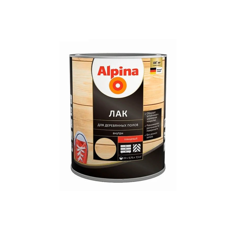 Глянцевый лак Alpina для защиты и декоративной отделки деревянных полов, паркета, лестниц и других внутренних деревянных поверхностей, подверженных интенсивной нагрузке. Объем 0,75 л. Создает прочное, износостойкое и эластичное покрытие с эффектным блеском.