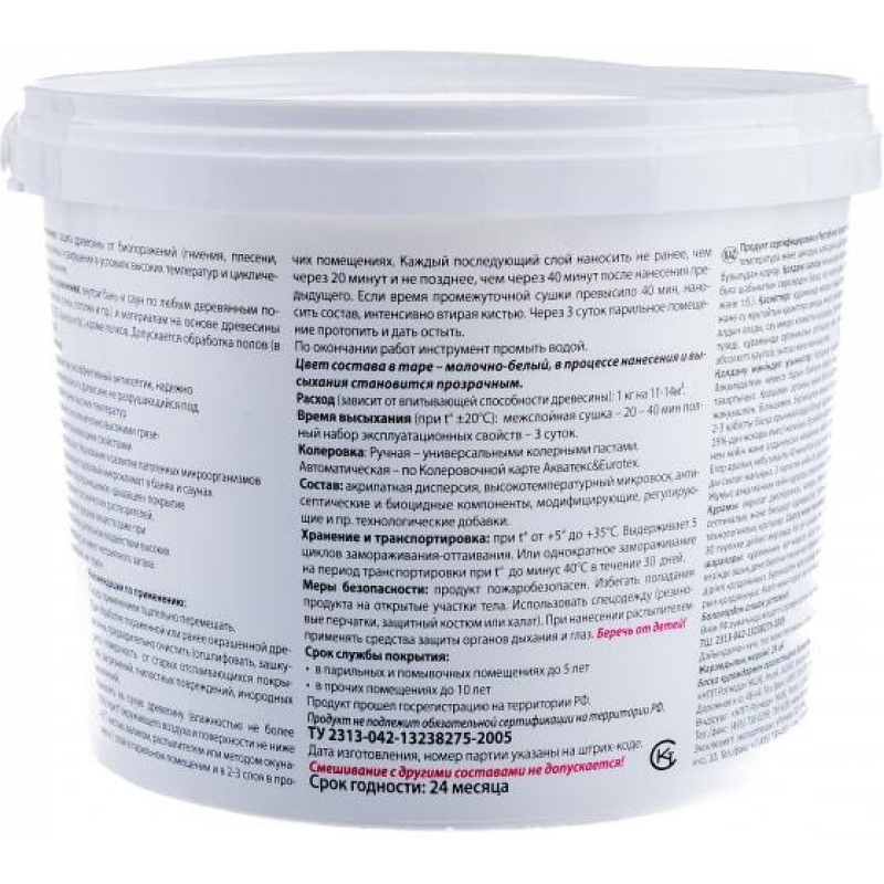 Наносится кистью, валиком или распылением на чистую сухую древесину (влажность до 15%) при температуре от +5°C. В парилке — 1 слой, в других помещениях — 2-3 слоя с межслойной сушкой 20-40 мин. Полное высыхание — 3 суток. Расход: 1 кг на 11-14 м². Разбавляется водой (не более 10%).