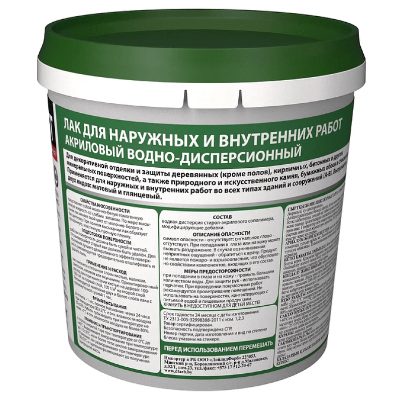 Универсальный матовый акриловый лак для наружных и внутренних работ. Обеспечивает прочное, эластичное и долговечное бесцветное покрытие. Обладает высокой паропроницаемостью, позволяя поверхности 'дышать'. Подходит для колеровки в любой цвет.