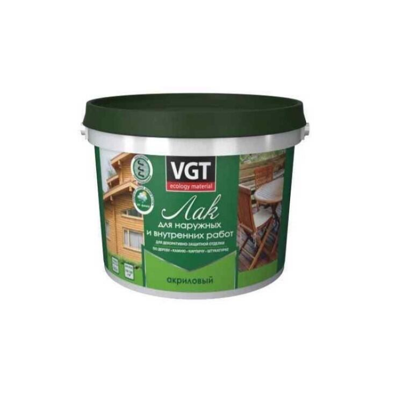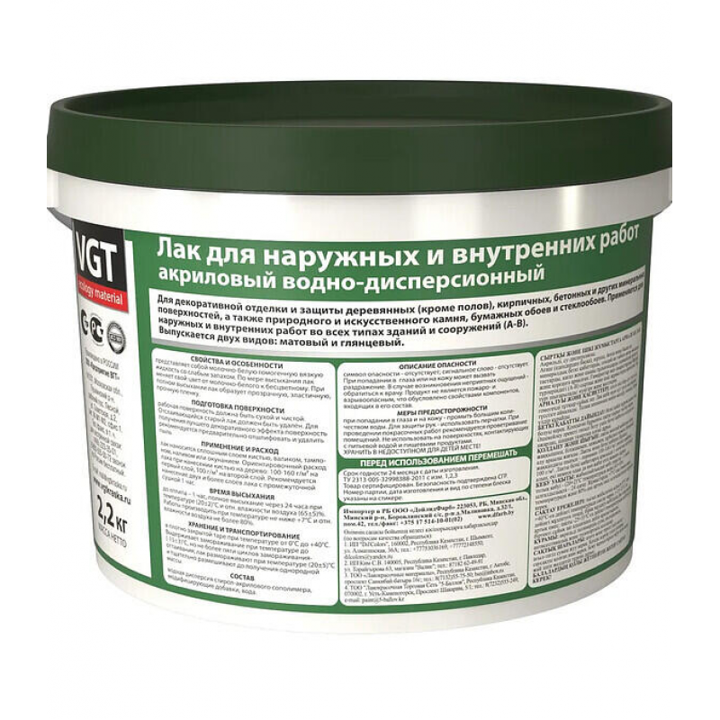 Матовый акриловый лак VGT для комплексной защиты и декоративной отделки. Подходит для наружных и внутренних работ по дереву (кроме полов), бетону, кирпичу, штукатурке, камню, а также для бумажных и стеклообоев. Образует прочное, эластичное, абсолютно прозрачное покрытие, устойчивое к влаге и выцветанию. На водной основе, с слабым запахом, возможность колеровки.