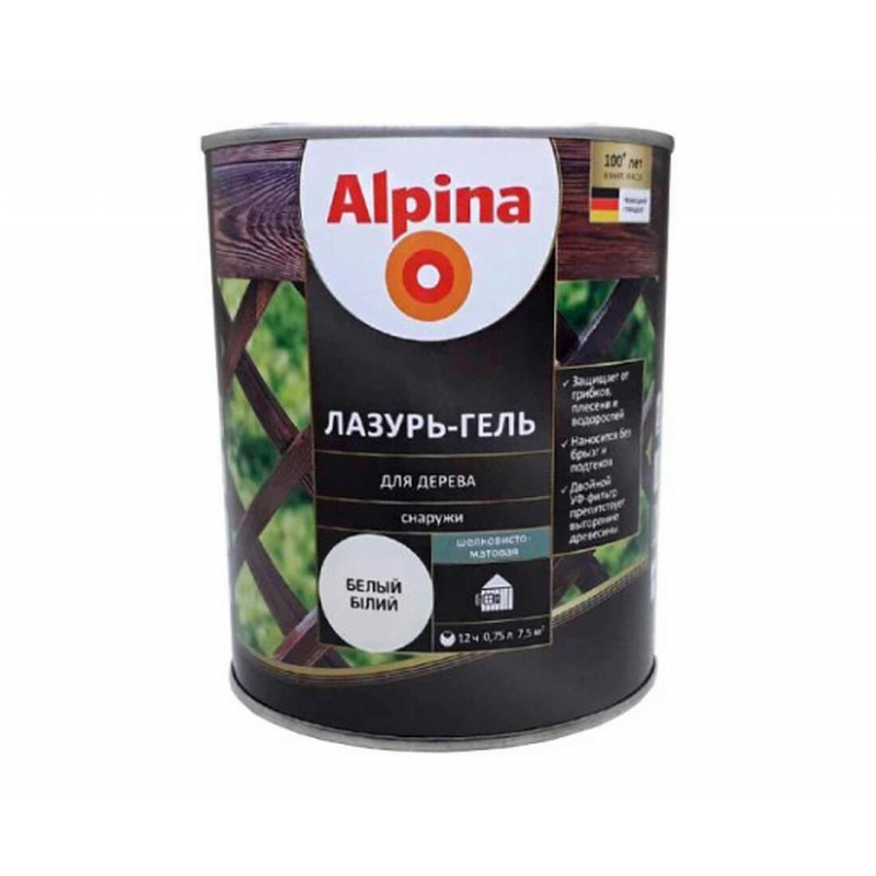 Лазурь-гель ALPINA на алкидной основе для надёжной защиты деревянных фасадов, заборов и других наружных конструкций от дождя, солнца и биопоражений. Сохраняет натуральную текстуру и дышащие свойства древесины. Шелковисто-матовый белый цвет.