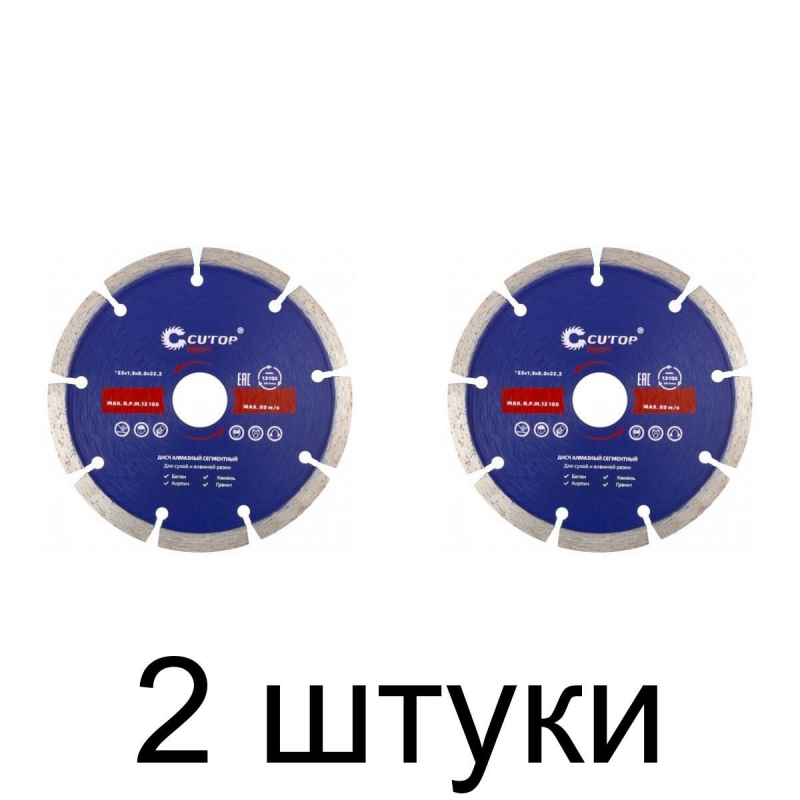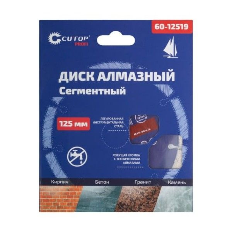 Диск отрезной алмазный сегментный 125x22.2 мм CUTOP 60-12519 предназначен для сухой и влажной резки бетона, кирпича, гранита, мрамора и камня. Изготовлен из инструментальной стали, режущая кромка содержит порошок из технических алмазов. Высота алмазного слоя 8 мм.Упаковка: картонный конверт.