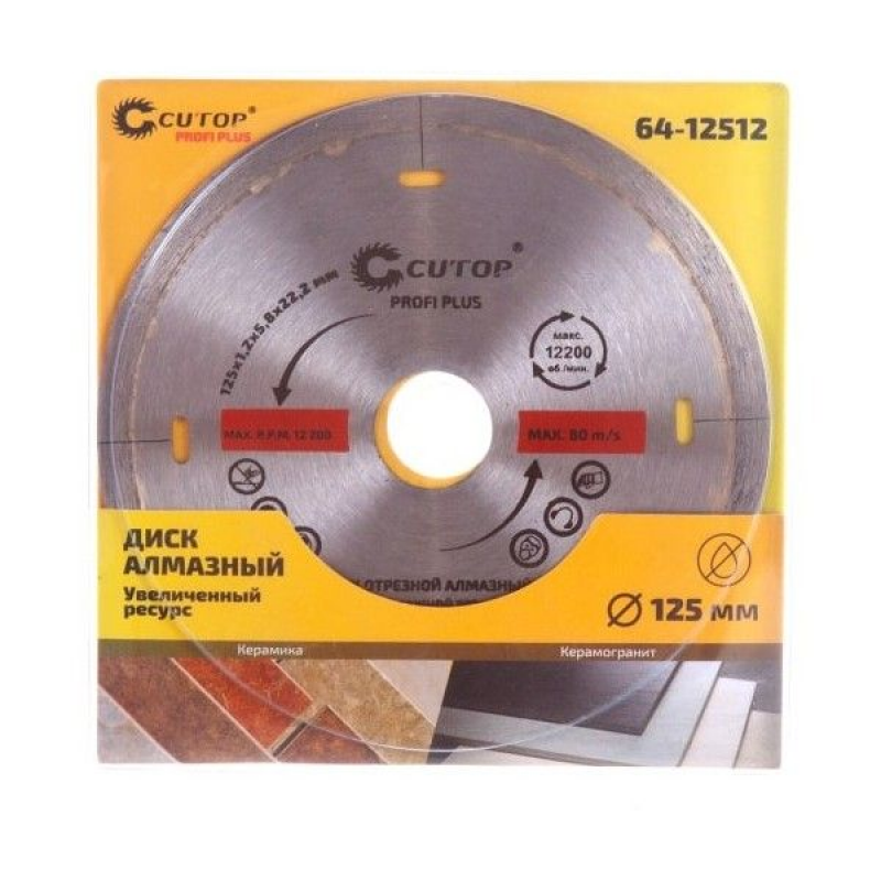 Диск Profi Plus 125x22.2 мм CUTOP 64-12512 - профессиональный отрезной алмазный диск для промышленного использования. Используется для влажной резки кафеля. Толщина диска 1,2 мм. Предназначен для углошлифовальных и отрезных машин. Повышенная изнокостойкость. Изготовлен из инструментальной стали, режущая кромка содержит порошок из технических алмазов. Высота алмазного слоя 5,8 мм.Упаковка: картонный конверт.