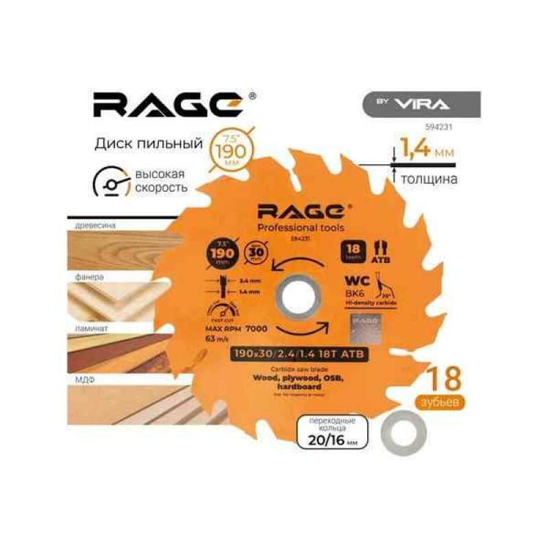 Диск RAGE 190 мм с 18 зубьями — это качественный инструмент, предназначенный для быстрого и эффективного распила, идеально подходящий для работ, требующих грубого и быстрого среза древесных материалов.