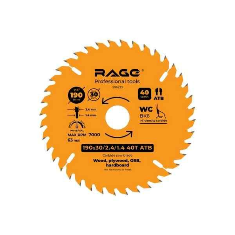 Диск RAGE 190 мм с 40 зубьями — это идеальный инструмент для тех, кто нуждается в точном и чистом распиле древесных материалов, предлагающий качественную финишную обработку и минимальные потери материала.