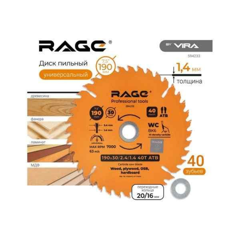 Диск пильный RAGE 190 мм (модель Vira) разработан для аккуратного и чистого распила древесных материалов, таких как дерево, фанера и МДФ. С 40 зубьями и конструкцией ATB, этот диск обеспечивает стабильное качество реза и высокую производительность, что делает его отличным выбором для финишной обработки.