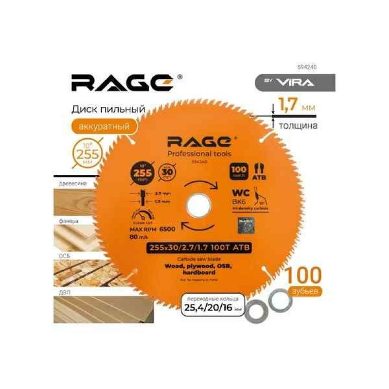 Диск пильный RAGE 255 мм (модель Vira) предназначен для выполнения особо точного и чистого реза по древесным материалам, включая дерево, фанеру и МДФ. Благодаря 100 зубьям и конструкции ATB, этот диск обеспечивает гладкий финишный срез, минимизируя сколы и обеспечивая высокую точность.