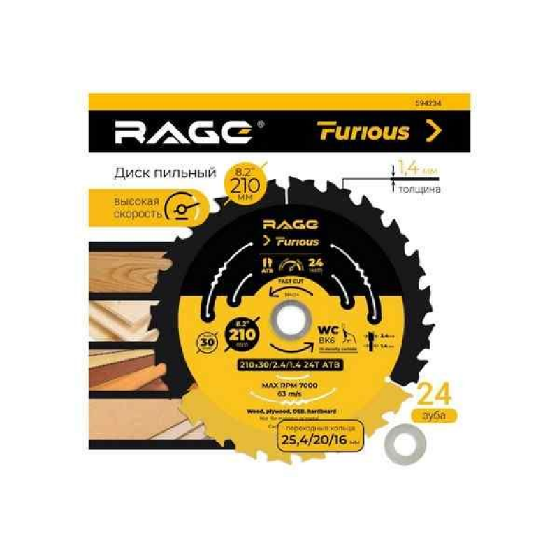 Диск RAGE Furious 210 мм с 24 зубьями — это качественный инструмент, подходящий для точного и аккуратного распила древесных материалов, предлагающий высокую производительность и минимальные потери материала.