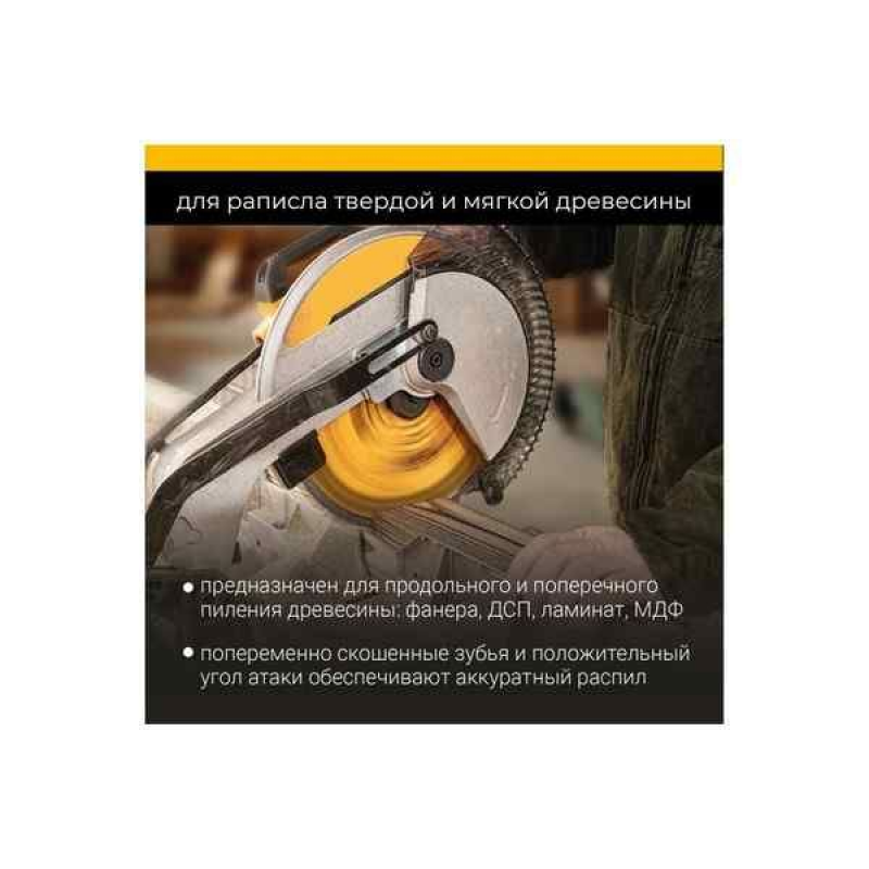 Материалы обработки: диск подходит для распила древесины, фанеры и МДФ, делая его универсальным решением для различных задач.