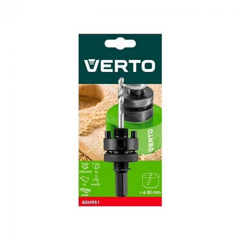 VERTO 60H951 поддерживает сухой тип сверления, что делает его удобным для использования в условиях, где применение охлаждающей жидкости нежелательно или не требуется. В комплект входит центрирующее сверло, которое помогает точно начать сверление и предотвращает смещение коронки. Державка также поставляется с держателем, что упрощает процесс установки и смены коронок.