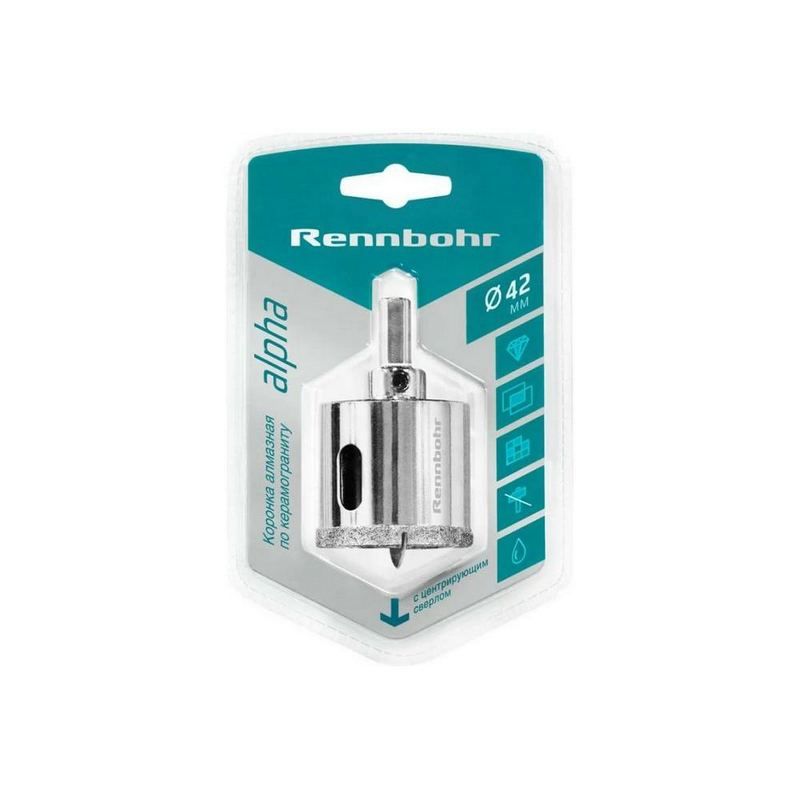 Коронка алмазная по плитке RENNBOHR 42 мм – эффективная коронка для мокрого сверления диаметром 42 мм, разработанная для работы с керамикой и керамогранитом. С цилиндрическим хвостовиком, центрирующим сверлом и держателем, она обеспечивает высокую точность. Производитель – Danyang Hi-tech Tools Co. Ltd, Китай. Вес – 0.18 кг.