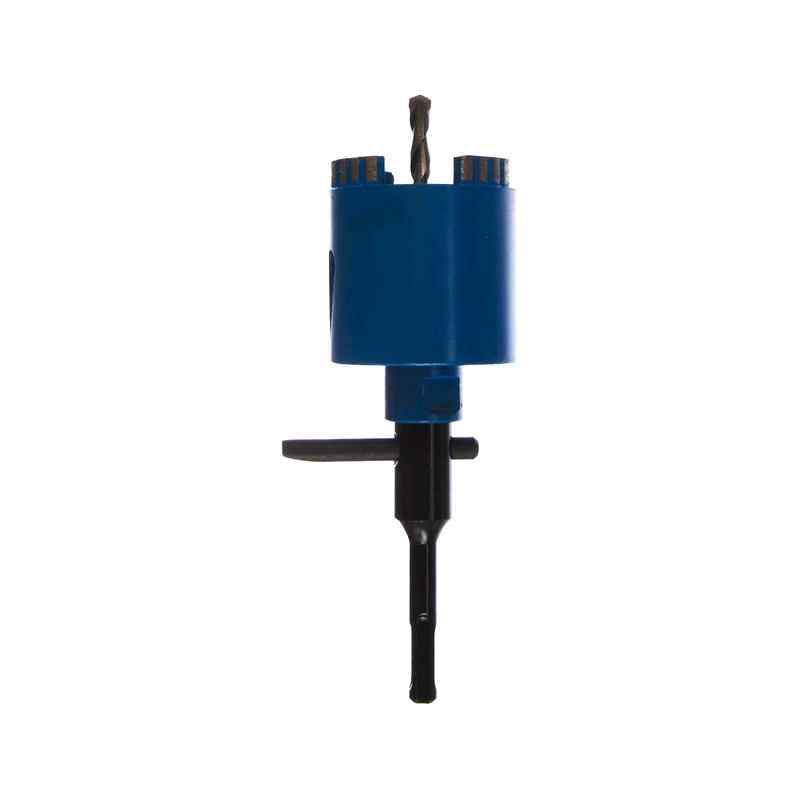 Коронка оснащена хвостовиком SDS-Plus, обеспечивающим надежное крепление в патроне перфоратора и быстрый монтаж без использования дополнительных инструментов. Рабочая длина 60 мм позволяет использовать ее для создания глубоких отверстий, необходимых при монтаже коммуникаций и установке крепежных элементов. Центрирующее сверло и держатель включены в комплект, что повышает точность и удобство при выполнении работ.