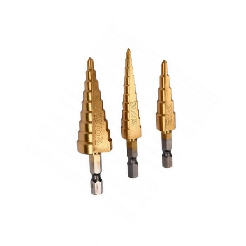 Набор ступенчатых сверл 3-12, 4-12, 4-20 мм 3 предмета YATO YT-44731. Сверла предназначены для сверления высококачественной нержавеющей стали, конструкционной и холоднокатаной стали, цветных металлов, листовой стали, пластика.Свойства:изготовлены из быстрорежущей стали HSS 4241, покрыты нитридом титана, увеличивающим срок службы сверл;края просверленного отверстия остаются чистыми и без заусенцев;самоцентрирование на изогнутых и скользких поверхностях;быстрый отвод тепла при сверлении твердых материалов;2 спиральные канавки для стружки эффективно удаляют стружку;рукоятка с 3 плоскими поверхностями дает возможность передачи максимального крутящего момента.