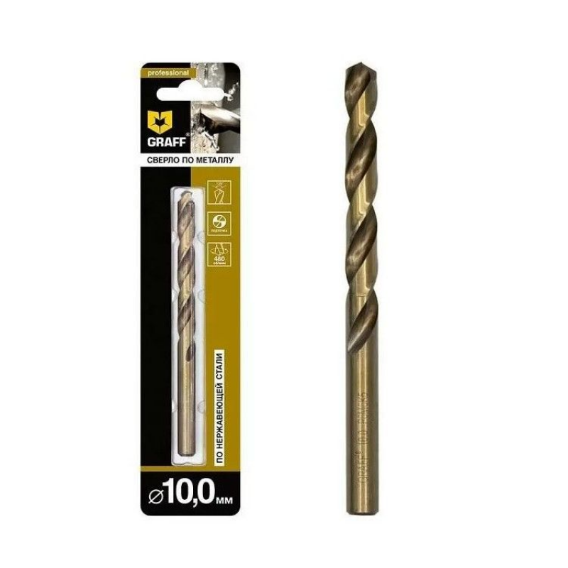 Профессиональное сверло по нержавеющей стали 10,0 мм GRAFF из быстрорежущей стали Р6М5К5. Данные сверла имеют более высокий класс точности А1 благодаря вышлифованной кромке.