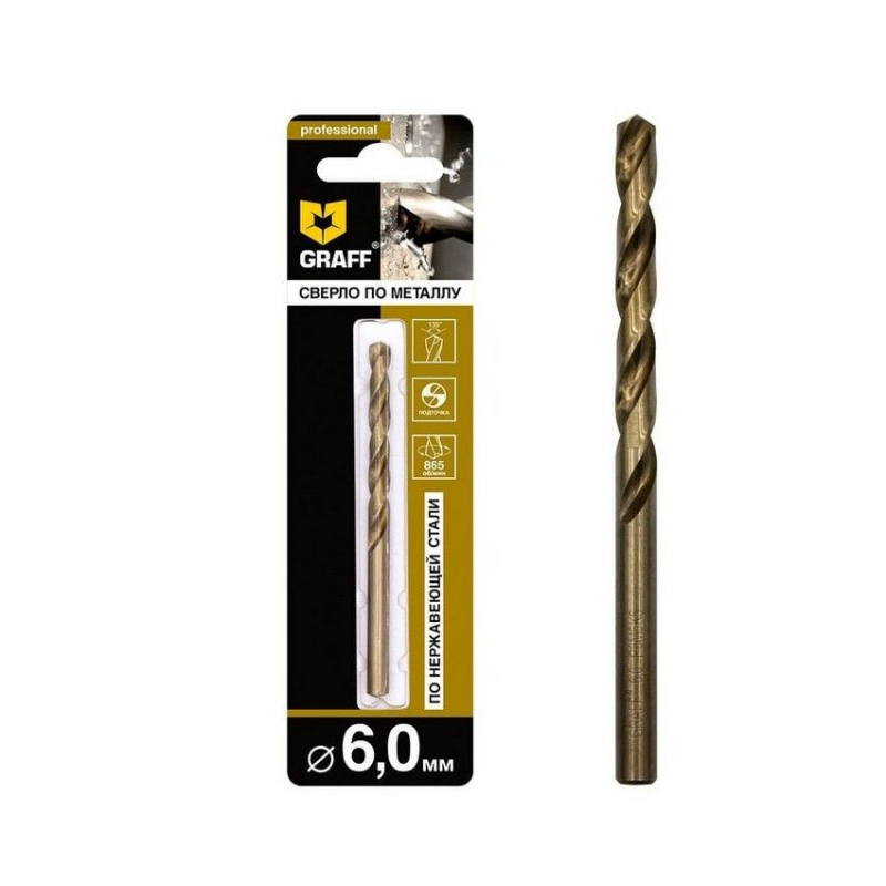Профессиональное сверло по нержавеющей стали 6,0 мм GRAFF из быстрорежущей стали Р6М5К5. Данные сверла имеют более высокий класс точности А1 благодаря вышлифованной кромке.
