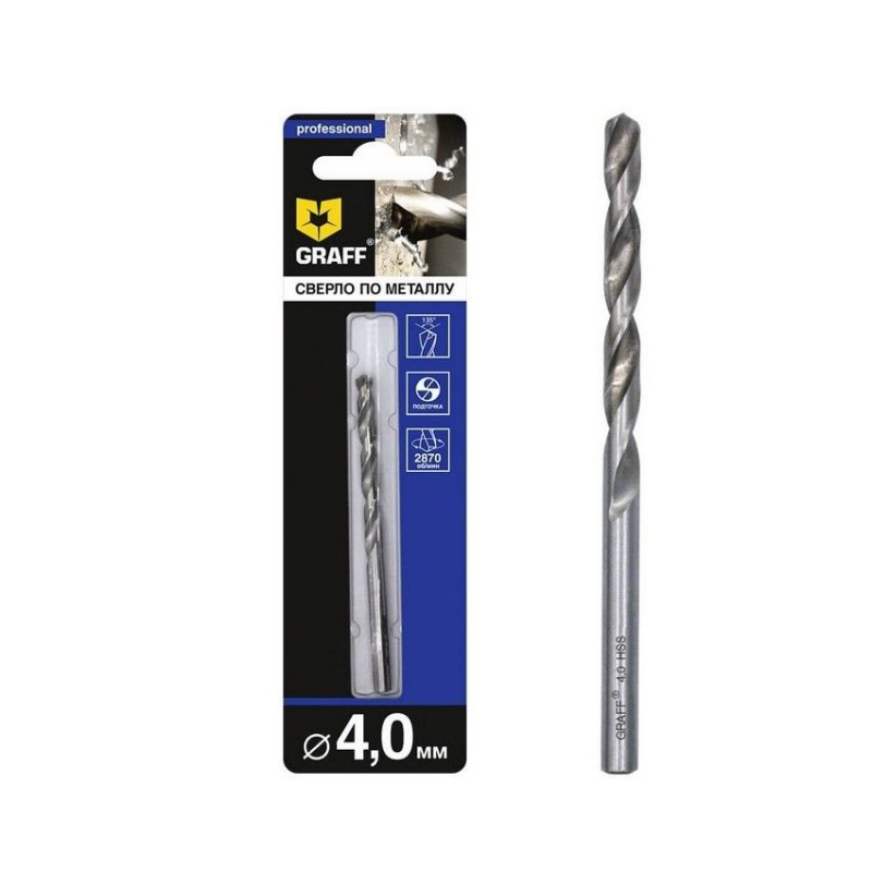 Сверло по металлу спиральное GRAFF из быстрорежущей стали HSS 4341, изготовленное методом вальцевания (продольно винтовой прокат) c вышлифованной кромкой, класс точности В1. Угол при вершине 135 градусов и крестовая подточка обеспечивают отличное сверление металла без предварительного засверливания. Сверло изготовлено по ГОСТ 10902-77 (DIN 338) и предназначено для сверления отверстий в легированных и не легированных сталях, ковких и серых чугунах.