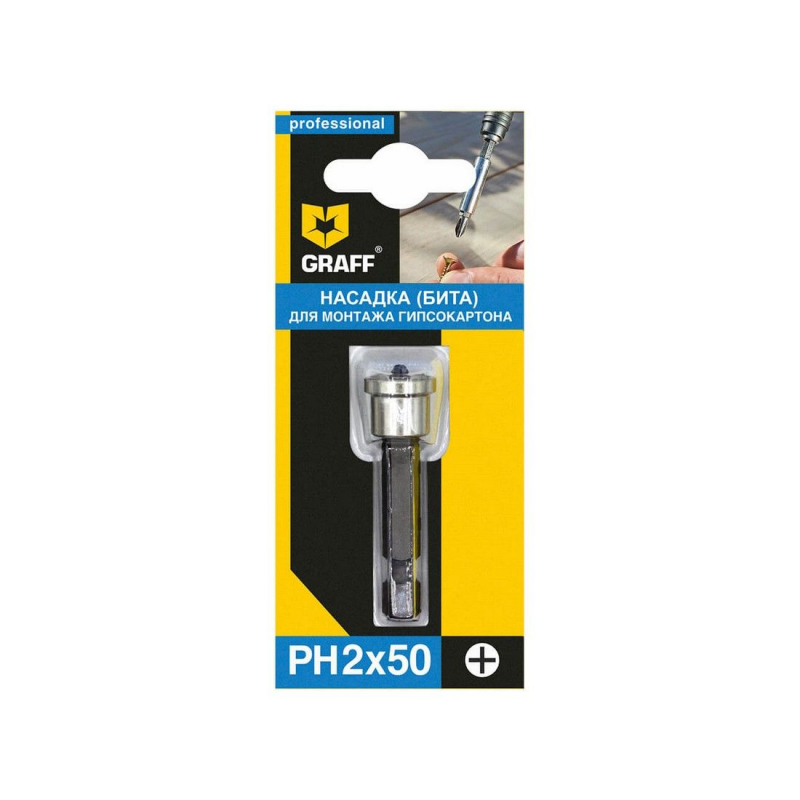 Бита GRAFF 350250 предназначена для шуруповертов. Применяется для монтажа/демонтажа крепежа, имеющего шлиц PH2. Насадка изготовлена из твердой марки стали с прокаливанием наконечника до твердости 60 HRC. Бита оснащена насадкой-юбочкой, ограничивающей глубину продавливания шляпки в лист гипсокартона.