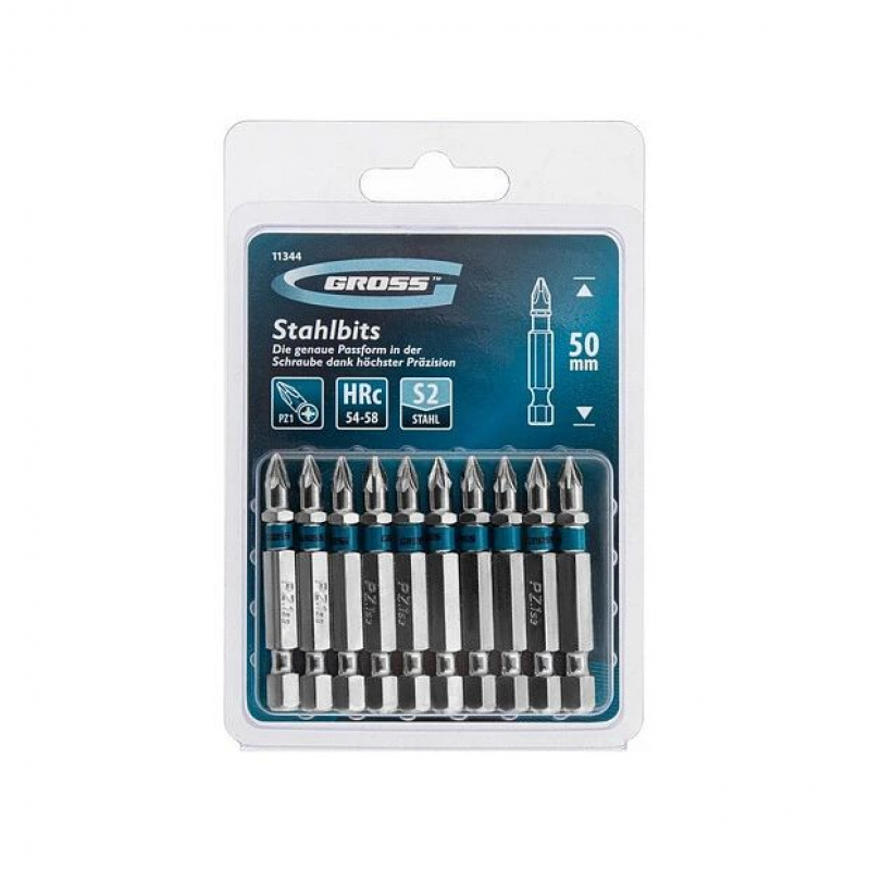 Набор бит PZ1х50, сталь S2, 10шт GROSS 11344 Биты применяются в качестве насадок для ручного и механического иструмента. Основу биты составляет шестигранный хвостовик размером 0,6 см (1/4 дюйма). Длина биты 50 мм, тип шлица - PZ1 (крестообразный с дополнительными направляющими). В качестве защиты от контрафакта на каждой бите присутствует цветное кольцо с логотипом торговой марки GROSS. Набор из десяти бит упакован в жесткую термоформованную пленочную коробку (double blister) размером 125 Х 85 мм.