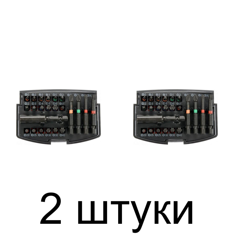 Набор включает биты с различными типами шлицов (PH, PZ, HEX, T), что делает его универсальным для множества крепежных элементов.