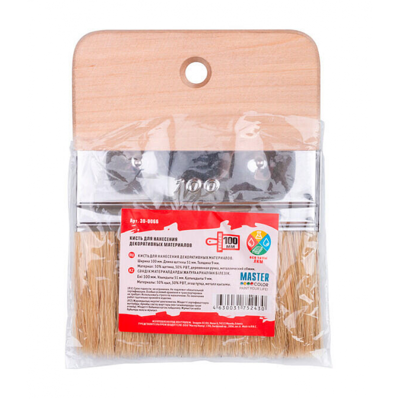 Кисть для декора MASTER COLOR шириной 100 мм — профессиональный инструмент для художественных и отделочных работ. Изготовлена из комбинированной щетины, сочетающей натуральные и синтетические волокна, что обеспечивает оптимальное удержание краски и равномерное нанесение. Длина щетины составляет 51 мм, что позволяет работать с различными типами материалов и текстур. Эргономичная деревянная ручка обеспечивает комфортный захват и контроль во время продолжительной работы.