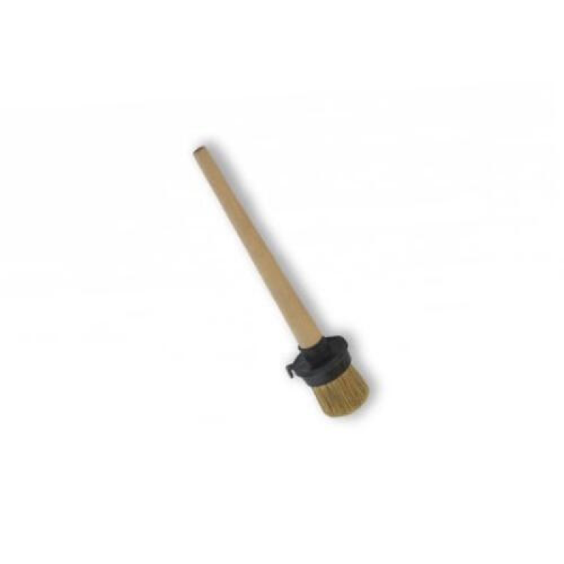 Натуральная свиная щетина для равномерного распределения ЛКМ, деревянная ручка для комфортного хвата, пластиковая обойма для надежной фиксации и износостойкости, круглая форма для работы на сложных поверхностях и в труднодоступных местах.