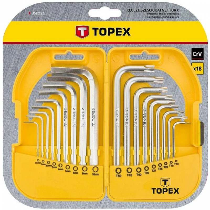 Набор ключей 6-гранных и Torx TOPEX 35D952 включает 18 ключей различных размеров: 1.5, 2, 2.5, 3, 4, 5, 6, 8, 10 мм, а также T10, T15, T20, T25, T27, T30, T40, T45 и T50. Эти Г-образные ключи с шаровым окончанием идеально подходят для работы с крепежом, оснащенным шлицом HEX и Torx, обеспечивая удобство при работе в ограниченных пространствах. Изготовлены из прочной стали, ключи обеспечивают долговечность и стойкость к износу. Комплект поставляется в удобной упаковке, которая позволяет легко хранить и организовывать ключи, делая их доступными для использования в любых работах, от мелкого ремонта до более сложных задач. Бренд TOPEX гарантирует высокое качество и надежность инструмента для профессионалов и домашних мастеров.