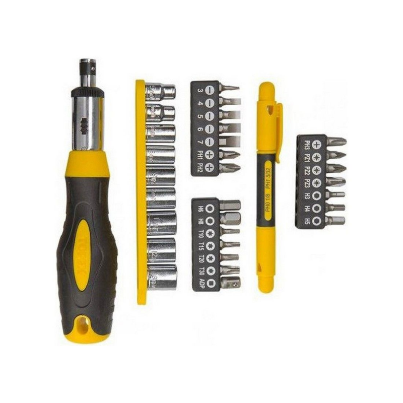 Отвертка реверсивная с битами TOPEX 39D522. Насадки и биты изготовлены из высококачественной хромованадиевой стали. В состав комплекта входит держатель в форме авторучки с наконечниками PH1и PH0. Количество предметов в наборе: 35 предметов.