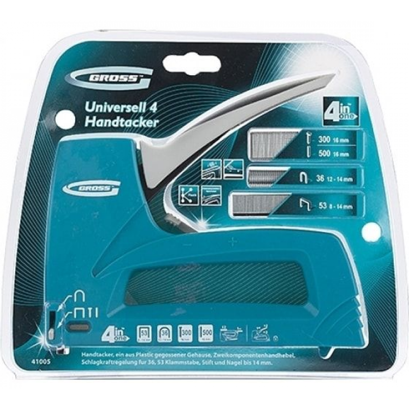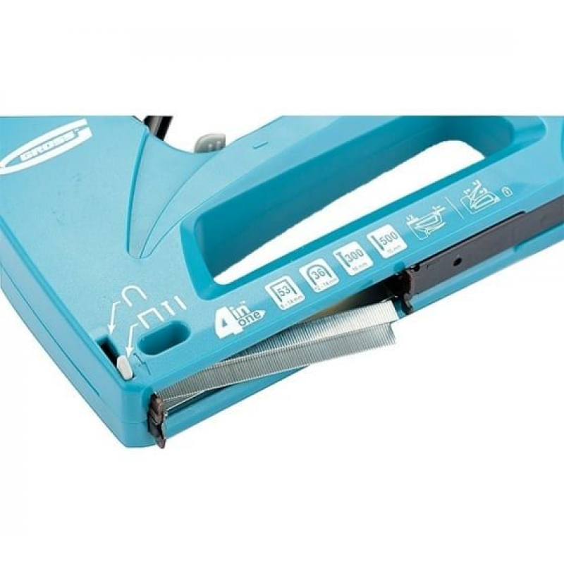 Степлер мебельный 4-функциональный GROSS 41005 - универсальный инструмент, применяемый на производстве. Он отлично сшивает материал. Используется со скобами: тип 53 (8-14 мм) и тип 36 (12-14 мм), гвоздями 16 мм и штифтами (гвозди без шляпки) 16 мм. Рукоятка из двухкомпонентного материала способствует удобству в работе. Для снижения времени на обслуживание расходный материал загружается у основания степлера.Особенности степлера GROSS 41005:Специальный выступ позволяет забивать гвозди в труднодоступных местах;На степлере мебельном 4-функциональном GROSS 41005 есть изображения технических характеристик.